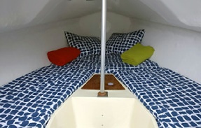 Small sailboats, the accomodation is suitable for two adults. Joe 17 is a so called pocket cruiser, 5,3 m long, 2,0 m wide keelboat, draft 1,0 / 0,5 m. 4-stroke outboard motor or an electric outboard motor + battery is included in rental price. When the centerboard is in the upper position, the draught is only 0.5 m which allows an easy landing even at small islands.