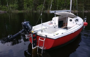 Small sailboats, the accomodation is suitable for two adults. Joe 17 is a so called pocket cruiser, 5,3 m long, 2,0 m wide keelboat, draft 1,0 / 0,5 m. 4-stroke outboard motor or an electric outboard motor + battery is included in rental price. When the centerboard is in the upper position, the draught is only 0.5 m which allows an easy landing even at small islands.